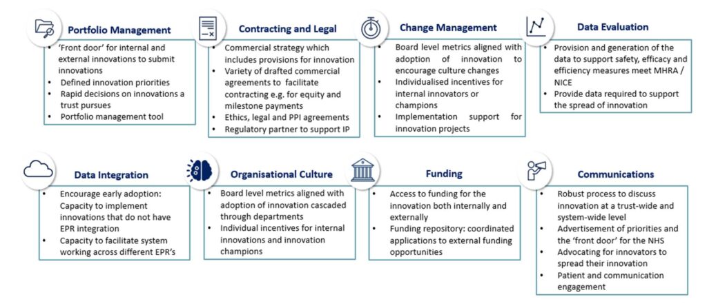 - Communicate publicly and with NHS staff so that the NHS sees innovation as a ‘must have’ activity, not a ‘nice to have’.