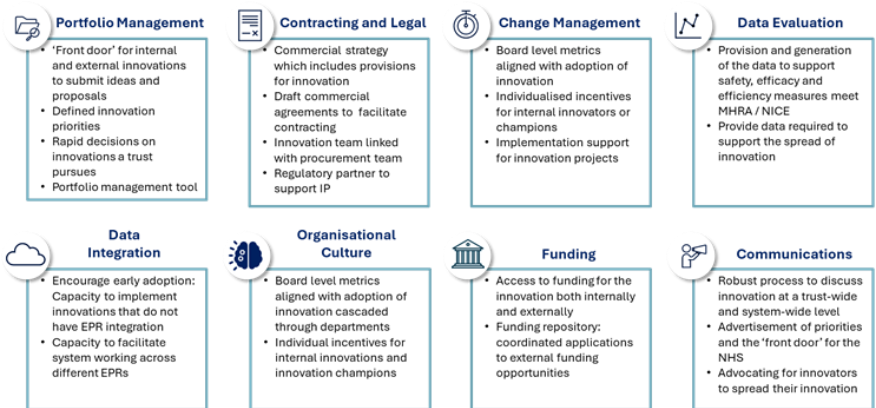 • Communicate publicly and with NHS staff so that the NHS sees innovation as a ‘must have’ activity, not a ‘nice to have’.